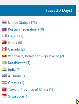 The table above provides stats for the last 30 days on what part of the world visitors originated from