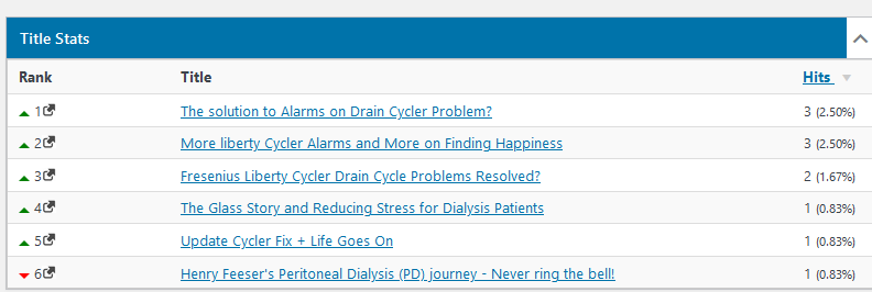 The table above ranks by topic the top searches. This may be used to generate more blogs about topics of interest. Based on the above, Cycler Alarms are of primary interest and I should consider blogging about the subject more often, assuming I have Germaine input.